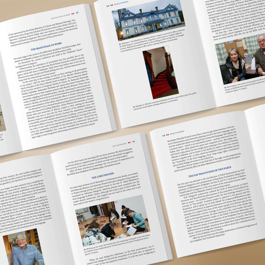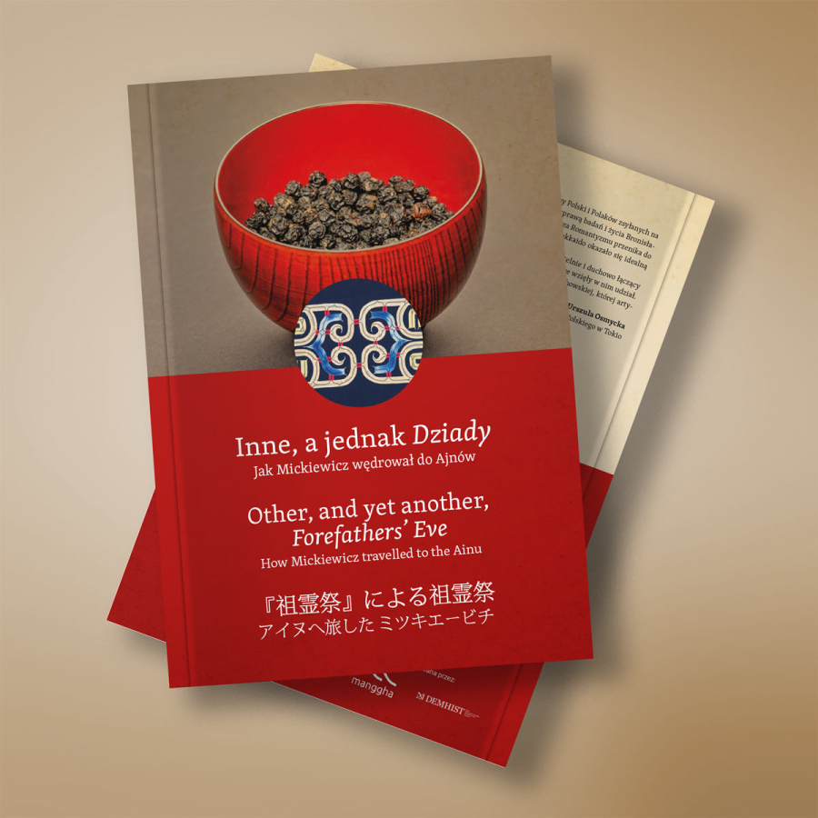 Ta publikacja – wydana w trzech językach (polskim, angielskim i japońskim) – opowiada o niezwykłym projekcie kulturalno-artystyczno-historyczno-lingwistycznym polegającym na wystawieniu fragmentu IV Części „Dziadów” Adama Mickiewicza w języku japońskim na dalekiej wyspie Hokkaido w Japonii. Miejsce wystawienia tego najsłynniejszego dramatu polskiego wieszcza nie było przypadkowe. Wszakże to tu i na pobliskim Sachalinie swoje pionierskie badania etnograficzne wśród Ajnów – tubylczej mniejszości etnicznej spychanej wówczas na margines życia społecznego – prowadził Bronisław Piłsudski, brat Marszałka. Przyniosły one młodemu badaczowi światowy rozgłos oraz na trwałe zapisały się w japońskiej kulturze i nauce. W zadziwiający sposób strofy Mickiewicza splotły z biografią Bronisława Piłsudskiego i odżyły oraz wybrzmiały na nowo w tak wydawałoby się odmiennym kulturowo środowisku. Publikacja powstała pod redakcją dr Jadwigi Rodowicz-Czechowskiej, dyrektorki ds. rozwoju w Muzeum Józefa Piłsudskiego w Sulejówku. We wstępach do niej możemy przeczytać m.in.: