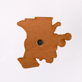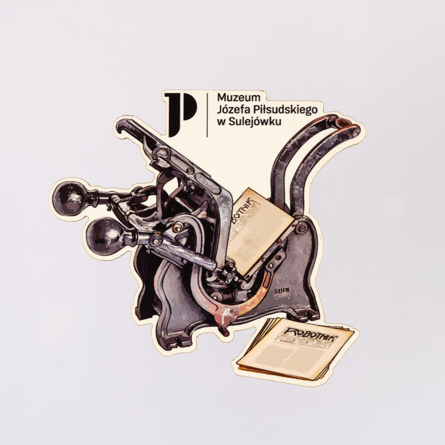 Magnes wydrukowany bezpośrednio na wyciętej laserowo sklejce o grubości 3mm. Motyw nawiązuje do tzw. bostonki, czyli maszyny drukarskiej, na której Józef Piłsudski drukował w konspiracji pismo „Robotnik”.